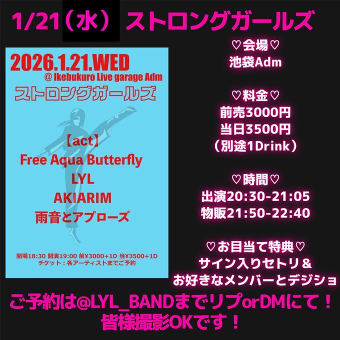 【LYL】サポート出演 - LIVE schedule/Ticket - 2026/01/21(水) 池袋Adm 1/21(水)ストロングガールズ 会場:池袋Adm 料金:前売3000円/当日3500円 時間:出演20:30-21:05/物販21:50-22:40 お目当て特典:サイン入りセトリ&お好きなメンバーとデジショ ご予約は @LYL_BAND までリプorDMにて! URLをコピーする 報告する